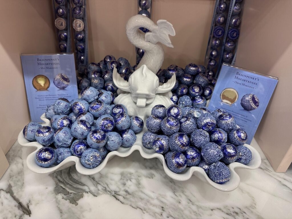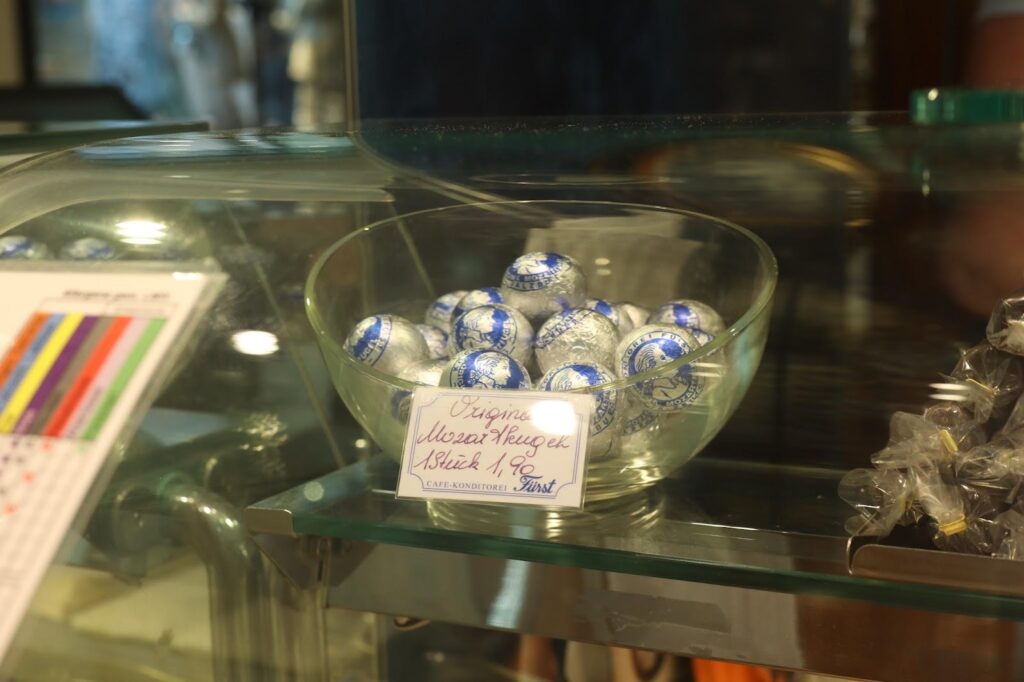 在糧食胡同,至少可以看到七八家在賣圓圓的、上面印著莫札特臉的巧克力球。