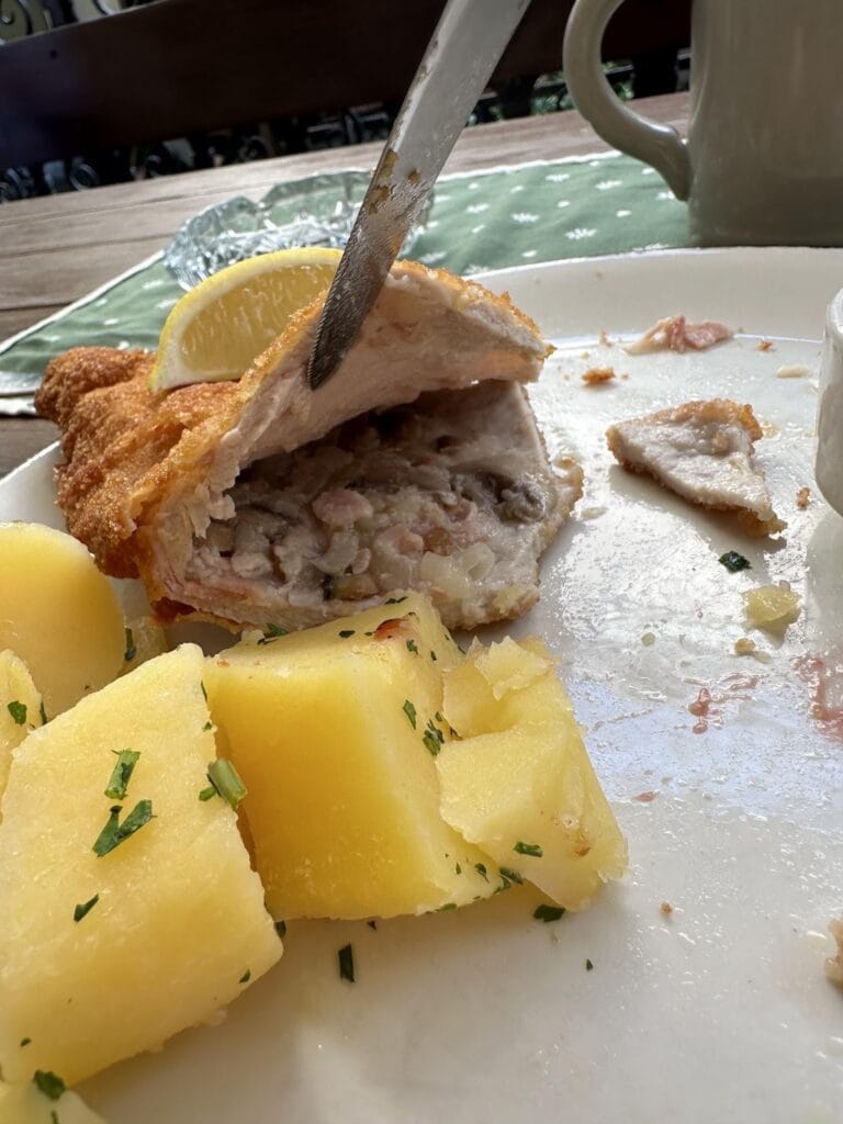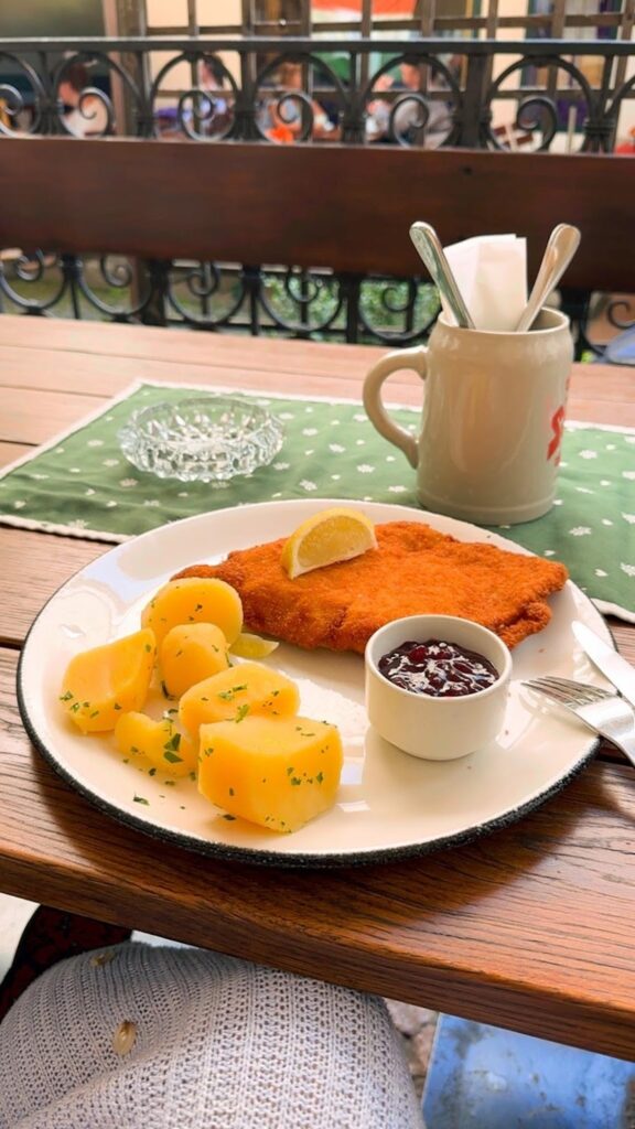 和日式豬排比起來薄上不少,旁邊那個長得像蔓越莓的是 Preiselbeere(越橘,Lingonberry)就是莓果酸甜的味道,和豬排搭起來應該是我前所未有的味覺體驗!可能我對炸豬排的想像太狹隘了,總之推薦給想嘗試奧地利道地菜色的旅人!