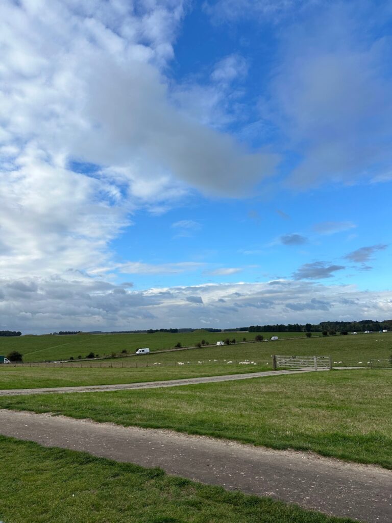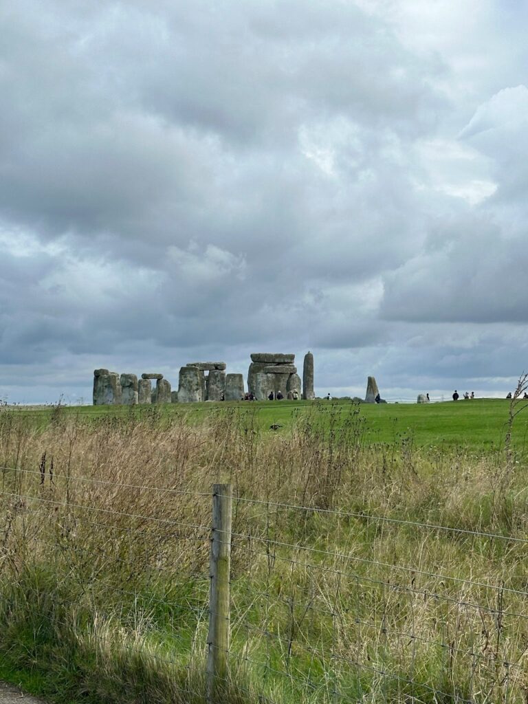 遊覽車抵達巨石陣後,會先從遊客中心換搭接駁車到靠近石圈處,一路上就是平疇沃野和小羊、英國鄉村的景色。不過因為保護底下文物的關係,一般遊客是禁止觸碰巨石或甚至是進入石圈內的。