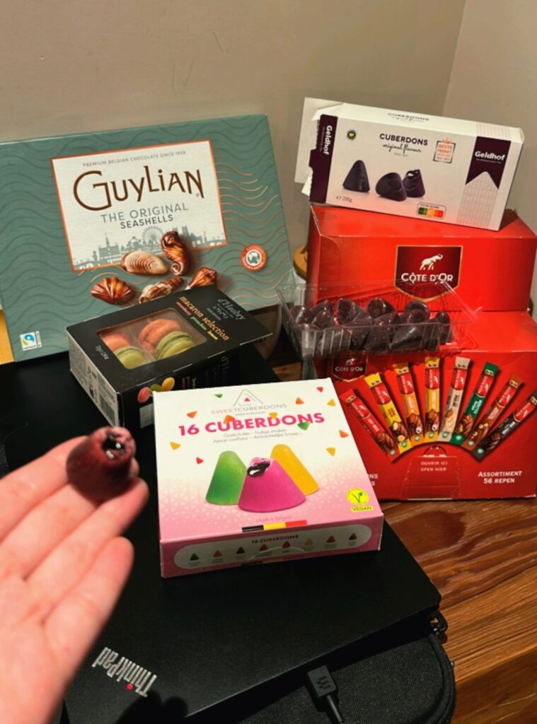 → Gent nose 根特鼻子糖最經典的是像右上角深紫色那樣,一口輕咬下會流出中間的糖漿液;而中間的那盒是不同口味的變化款。但我私心比較推右上角那個牌子的。